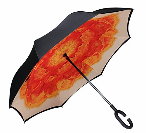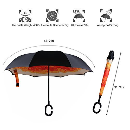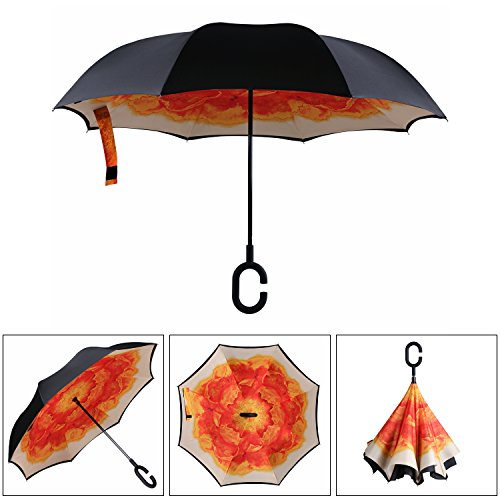 Bagail Double Layer Inverted Umbrellas Reverse Folding Umbrella Windproof UV Protection Big Straight Umbrella for Car Rain Outdoor With C-Shaped Handle Orange Flower