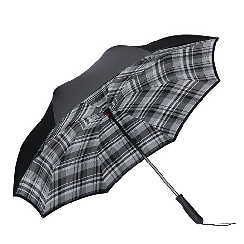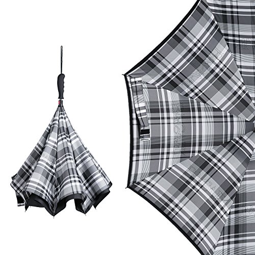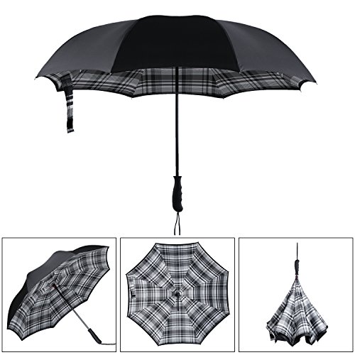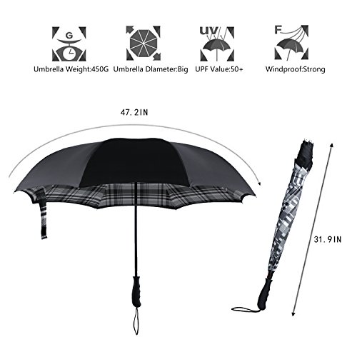 Bagail Double Layer Inverted Umbrellas Reverse Folding Umbrella Windproof UV Protection Big Straight Umbrella for Car Rain Outdoor With Straight Handle Grid
