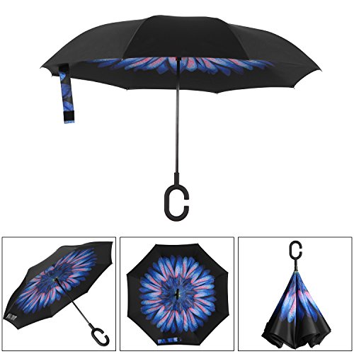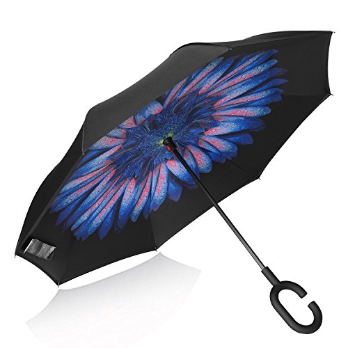 Bagail Double Layer Inverted Umbrellas Reverse Folding Umbrella Windproof UV Protection Big Straight Umbrella for Car Rain Outdoor With C-Shaped Handle Blue Flower
