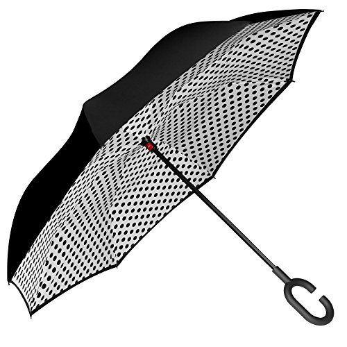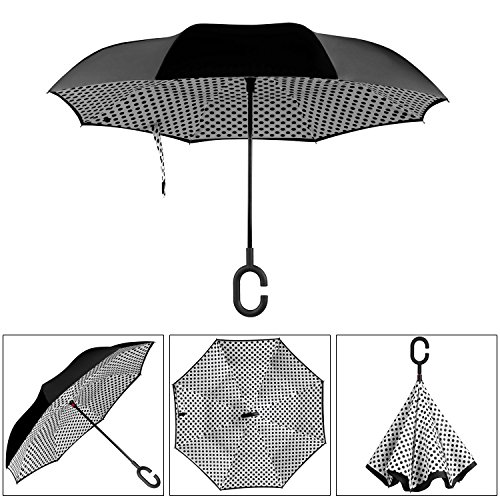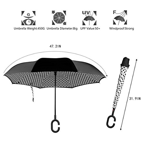 Bagail Double Layer Inverted Umbrellas Reverse Folding Umbrella Windproof UV Protection Big Straight Umbrella for Car Rain Outdoor With C-Shaped Handle White Dot