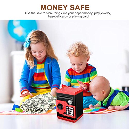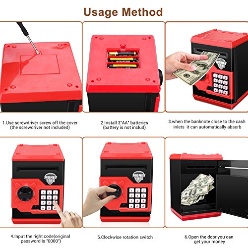 Studio : Zonkin Publisher : Zonkin Binding : Toy Product Description Product instructions: ★ How to use: 1.Install your ordinary 3 AA batteries. Enter the four-digit passwords (default 0000); 2.Green lights on, then rotate the knob clockwise to open the door. Note:If you enter the wrong passwords, the red light will be illuminated,and remind you "please try again". ★ How to change password: 1.Enter the current password (default 0000) to open the door of the safe.Long press "*" button, green light and red flashing. 2.Input 4 new passwords in 15 seconds, according to the "#" confirm new password storage. Two lights stop flashing. 3.If the new password is not entered in 15 seconds, the program will stop and the program must be restarted.Release the "*" button and close the door. Note:If you forget your password,you can remove the battery and then insert the new password is 0000. Reset again. ★About Batteries: 1.Please use the new battery,3x1.5V AA Battery(Product not included) 2.Do not mix the use of new and old batteries. 3.If you don't use it for a few weeks, remove the battery. Specifications: 1.Material: Environmental ABS plastic 2.Color: Red black 3.Power Source: 3x1.5V AA Battery(Not included) 4.Product Size: 8.5 X 5.1x7.1 Inches 5.Product weight: 900 g Package includes: 1X Zonkin Electronic Piggy Bank 1 x English Use Manual Our products are well tested before delivery,please feel confortable to buy, If any problem, please feel free to contact us ,we'll help you at once. 0