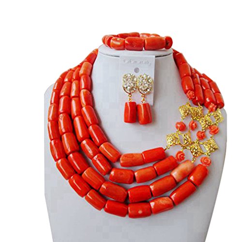 -. Title : laanc Highly Necklace Jewelry Sets Natural Coral 4 Rows Orange-Gold Nigerian Women African Beads A-039D