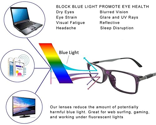 -. Feature : PROTECT YOUR EYES AND SLEEP BETTER - our computer reading glasses block blue light than any other normal glasses. Anti-Reflective, Anti-Glare lens coating prevents insomnia and macular degeneration, wear the anti blue ray glasses ensure you better sleep and greatly reduce eye strain, eye dry and headaches.All of glasses are tested by professional machine / YOUR MONEY SPEND IS WORTH IT - wear our computer reading glasses also called gaming glasses,blue light blocking glasses when you staring at computer,gaming,palying with smartphone and other electronic devices in office,at home,at bed etc,the glasses make computer users and gamers feel comfortable and no strain from screen radiation / SUPERB DURABILITY - our blue light filtering glasses pay close attention to "lens not clear""hinges loose up""screws fell off""broken easily",we use high quality computer lenses, heavy duty sP.R.Ing-loaded hinges,sure-flex comfortable arms,quality credible material ensure glasses withstand your daily and long term eye protection,which outshine roughly made gaming glasses / ENHANCE YOUR ATTRACTIVENESS - how you look is as important as how clearly you can see, Fashion comfortable style and special design of the computer reading glasses enrich you more attractive / AMAZING CUSTOMER SERVICE - After you purchase our anti blue glasses,if you encounter following situation: wrong fit ,Pinchy-tight, or too-loose , which slide down your nose are enough to drive anyone crazy,In case any broken problem happens, contact the seller of EyeYee without hesitation to solve the problem until satisfaction. 90days money back lifetime lens and frame breakage warranty. You have no risk to try