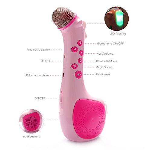 THREE WAYS TO PLAY! Magic voice: it can switch 5 different voices to sing. Sling-along: portable karaoke for family; Speaker: it also used as a handheld Bluetooth speaker and support TF card (Not include).