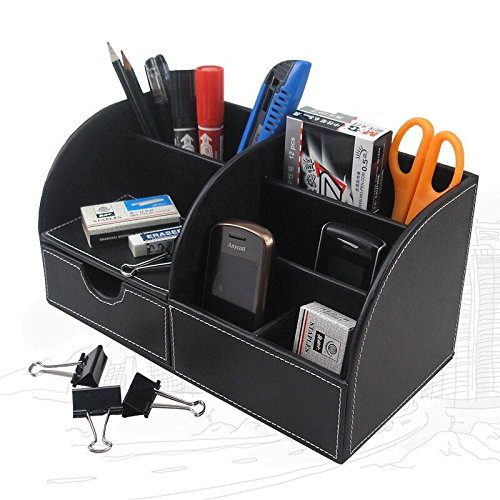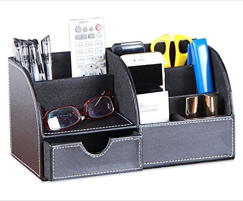 Attractive ,stylish design and large capacity ;5 divided compartments to organize all your office supplies, pen/pencil, scissors, remote control , cell phone and cards or other small supplies; Small-notched supply drawer pulls out to hold 4- by 4.5-inch notepads