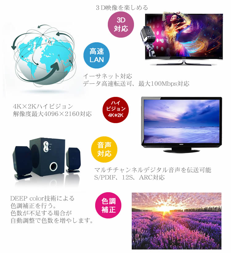 ■HDMIにより映像と音声をデジタルのまま高速伝送するだけでなく、100Mbpsのイーサネット(Ethernet)通信を1本のHDMIケーブルで実現するHEC(HDMIイーサネットチャンネル)に対応 デジタル音声を、ハイビジョンTVなどのHDMI受信側からAVアンプなどの送信側へ伝送できるARC(オーディオリターンチャンネル)に対応