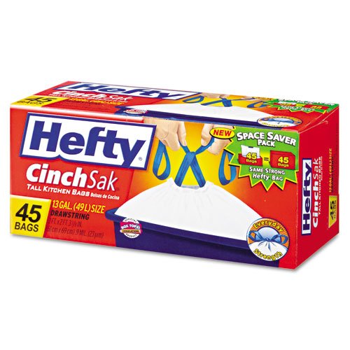 -. Binding : Kitchen -. Brand : Naruekrit -. EAN : 0885467996024 -. Feature : Strong and durable; easy to lift and carry. / Convenient drawstring closure is easy to close and makes the bag easy to lift and carry. / Unscented Odor Block technology neutralizes garbage odors without adding any unwanted scents or fragrances--leaves your kitchen smelling the way you want. -. Label : Naruekrit -. Manufacturer : Naruekrit -. MPN : Hefty Products-E86755 -. NumberOfItems : 1 -. PackageQuantity : 1 -. PartNumber : Hefty Products-E86755 -. ProductGroup : Home -. ProductTypeName : HOME -. Publisher : Naruekrit -. Studio : Naruekrit -. Title : Hefty Products - Hefty - Cinch Sak Tall Kitchen & Trash Bags, 13 gal, White, 45 Bags/Box - Sold As 1 Box - Strong and durable; easy to lift and carry. - Convenient drawstring closure is easy to close and makes the bag easy to lift and carry. - Unscented Odor Block technology neutralizes garbage odors without adding any unwanted scents or fragrances--leaves your kitchen smelling the way you want. -. UPC : 885467996024