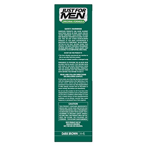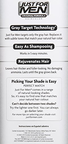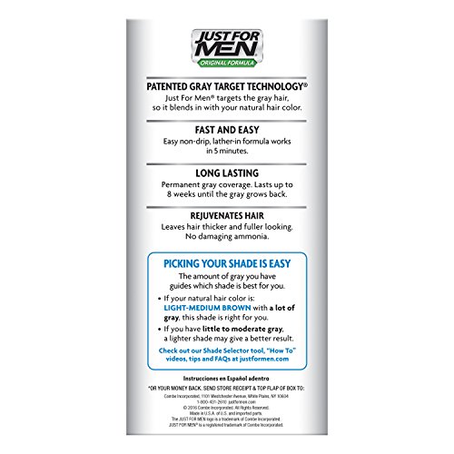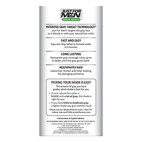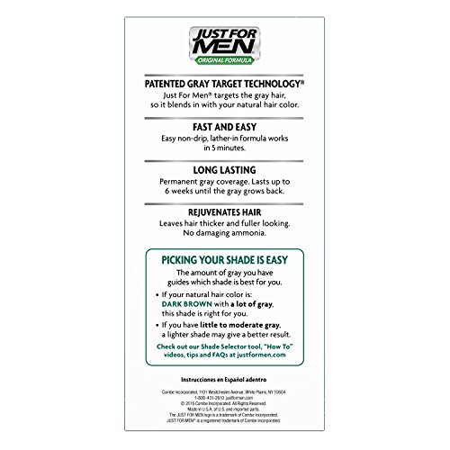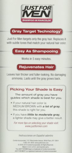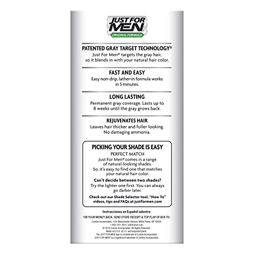 [Description] Product of JUST FOR MEN Natural looking full gray coverage Targets only the gray for a natural look Works in 5 easy minutes Easy_ non-drip Shampoo-In Formula Lasts up to 8 weeks_ or until your gray grows back (Packaging May Vary) Shampoo-in hair color darkest brown number H-50 was launched by the design house of Just For Men It is recommended for normal use Shampoo-in hair color darkest brown number H-50 by Just For Men for men - 1 application hair color