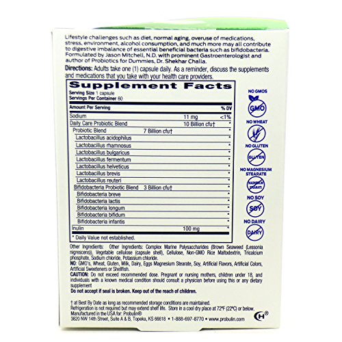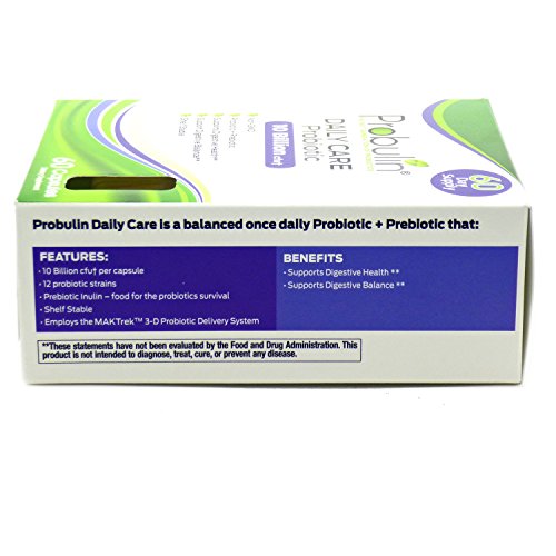 Studio : Probulin Publisher : Probulin Binding : Health and Beauty Product Description Problem Daily Care is a once daily Probiotic Prebiotic with the following features and benefits: 10 Billion cfu† per capsule 12 probiotic strains Prebiotic Inulin - food for the probiotic's survival Shelf stable Supports digestive health** Supports digestive balance** 0