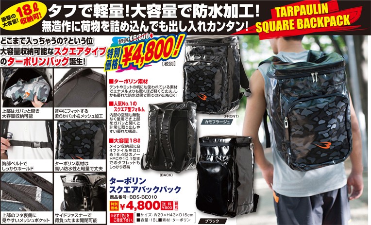 タフで軽量!大容量で防水加工!大容量18L収納可バックパック!通常7344円(税込)の処、30%OFF特別価格5184円にて限定販売!衝撃の大容量!無造作に荷物を詰め込んでも出し入れカンタン!どこまで入っちゃうの?という位大容量収納可能なスクエアタイプのターポリンバッグ誕生! ■ターポリン素材/テントやヨットの帆にも使われている素材で、エナメルよりも驚くほど軽くて丈夫。 しかも優れた防水効果で雨での外出もOK! ■人気No.1のスクエア型フォルム 内部の空間も無駄なく使用でき上部をガバッと開くと非常に取り出しやすい優れた構造。 ■大容量18リットル メイン収納部にB4ファイルをはじめ、16.4型のノートPCや10.1型までのタブレットもしっかり収納!