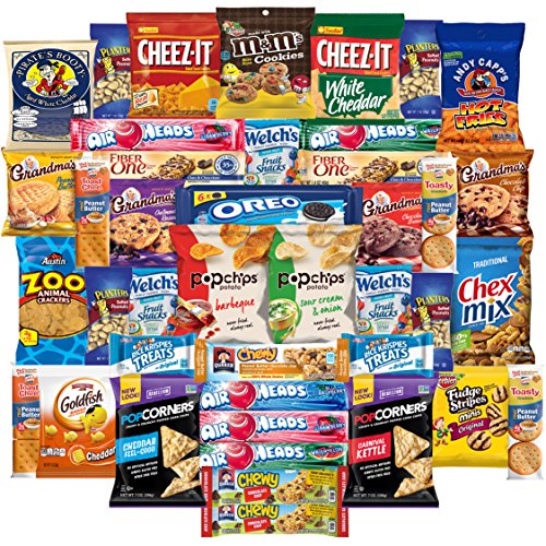 4 Grandmas Cookies (2.5 oz) 1 Cheez It (1.5 oz) 1 Cheez It White Cheddar (1.5 oz) 1 Oreos (2 oz) 1 Snyders (1.5 oz) 1 Gold Fish (1 oz) 1 Chex Mix (1.75 oz) 1 m&m Cookies (1.6 oz) 1 Keebler Fudge Stripes (2 oz) 1 Andys Hot Fries (0.85 oz) 1 Pirates Booty (0.5 oz) 1 Animal Crackers (2 oz) 2 Fiber One Bars (1.4 oz) 4 Planters Peanuts (1 oz) 3 Rice Krispies (0.78 oz) 3 Welches Fruit Snacks (0.9 oz) 3 Airheads (0.55 oz) 3 Quaker Chewy Bars (0.78 oz) 4 Lances Crackers (1.52 oz) 5 Wise Chips (0.75 oz)