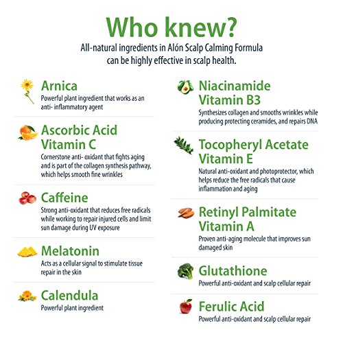 Vitamin B3 (niacinamide), now a medically recognized skin healing ingredient, as well as scientifically important Melatonin, Caffeine, Vitamin A palmitate, resveratrol, Vitamin E, Aloe, Ferulic Acid, Calendula, Arnica, Green Tea Extract, Glutathione, Coconut and Virgin Olive Oil are just some of the antioxidant and reparative molecules in Alon Labs Scalp Calming Lotion.