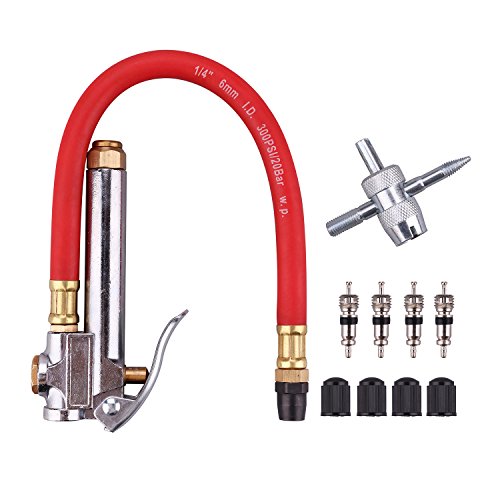 -. Feature : Straight-on Tapered Chuck Inflator - Heavy Duty / 12" red heavy duty flexible air hose / Chrome plated castings with brass internal parts / Solid brass bar / Calibrated 10 to 90 psi in 2 psi increments