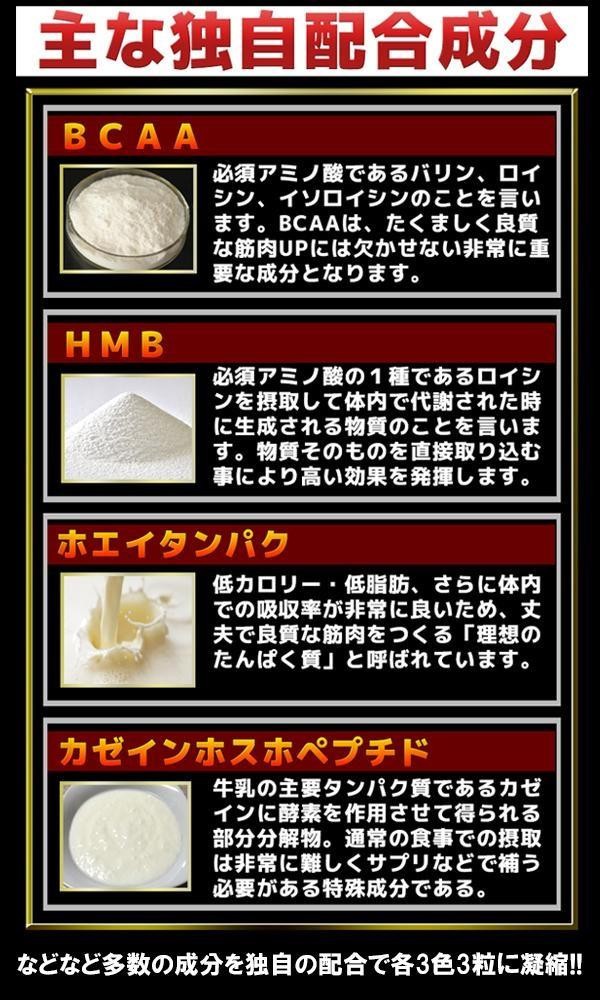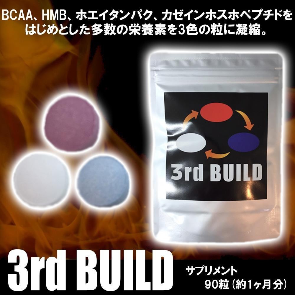 | 従来の「溶かして飲むタイプ」のプロテインは、作るのが面倒だったり、味が苦手という方も多いはず。3rd BUILD(サードビルド)はBCAAやHMB、ホエイタンパクにカゼインホスホペプチドなどの成分を赤・青・白の3粒に凝縮。手軽で飲みやすい錠剤タイプに仕上げました。 |