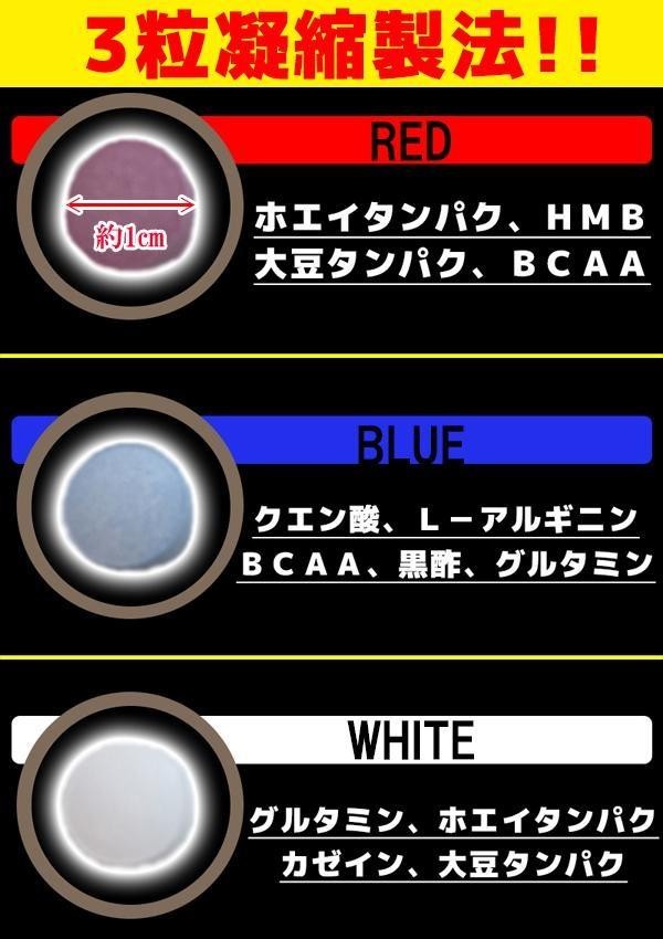 | 原材料 | 名称:ホエイタンパク含有加工食品/L-シトルリン含有加工食品/大豆タンパク含有加工食品 【赤粒】 ホエイタンパク、大豆タンパク、L-シトルリン/セルロース、ショ糖脂肪酸エステル、微粒二酸化ケイ素、HMB-Ca、野菜色素、L-バリン、L-ロイシン、L-イソロイシン※原料の一部に乳を含む 【青粒】L-シトルリン、黒酢末/セルロース、ショ糖脂肪酸エステル、微粒二酸化ケイ素、L-アルギニン、グルタミン酸、クエン酸、スピルリナ色素、L-バリン、L-ロイシン、L-イソロイシン 【白粒】大豆タンパク、ホエイタンパク、カゼインホスホペプチド(乳成分を含む)/セルロース、ショ糖脂肪酸エステル、微粒二酸化ケイ素、L-グルタミン※原料の一部に乳を含む |
