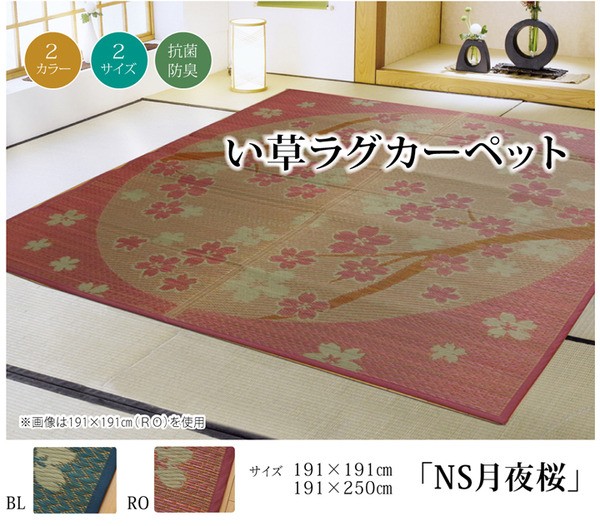 【商品名】 い草ラグカーペット 桜柄 『NS月夜桜』 ローズ 約191×191cm (裏面:滑りにくい加工) 【ジャンル・特徴】 おしゃれ デザイン ラグマット ラグカーペット じゅうたん 絨毯 お洒落 ■サイズ・色違い・関連商品■約191×191cm ローズ[当ページ]■約191×191cm ブルー■約191×250cm ローズ■約191×250cm ブルー関連商品の検索結果一覧はこちら 桜をあしらったい草ラグです。日本文化と馴染みの深い桜とい草は相性が良く、和の空間を演出してくれます。裏面には滑りにくい加工をした不織布を使用しているため、フローリングにも最適です。い草には空気の自然浄化作用、湿度の調節作用などがあります。い草に青森ヒバ加工を施しています。(抗菌、防臭効果)■商品スペック【サイズ】約191×191cm 2畳【素材】表地=い草 裏地=ポリエステル100%(不織布) ※滑りにくい加工 中材=ウレタンフォーム3mm※普通織ポリエステル100%※普通織 ヘリ=ポリエステル100%【洗濯表示】洗えません。【原産国】中国製【配送日時指定について】・この商品は、配送希望日と時間帯