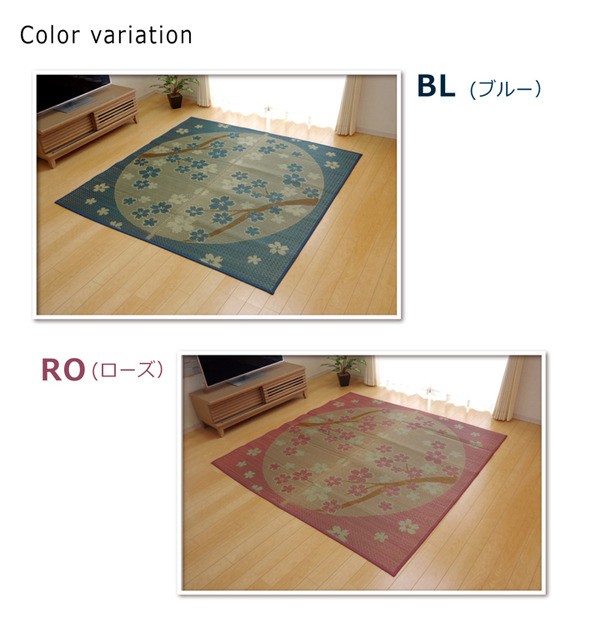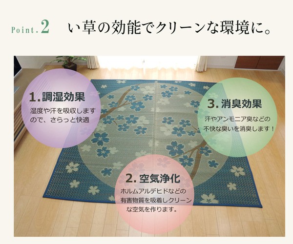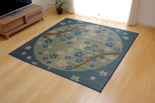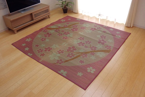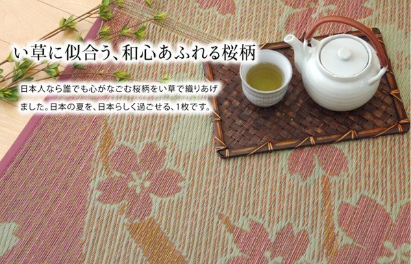 桜をあしらったい草ラグです。日本文化と馴染みの深い桜とい草は相性が良く、和の空間を演出してくれます。裏面には滑りにくい加工をした不織布を使用しているため、フローリングにも最適です。い草には空気の自然浄化作用、湿度の調節作用などがあります。い草に青森ヒバ加工を施しています。(抗菌、防臭効果)