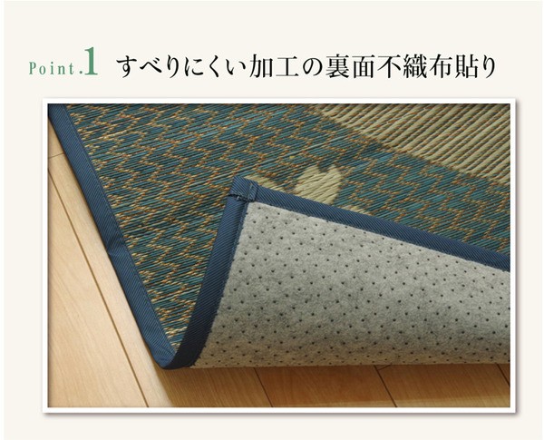 【素材】表地=い草 裏地=ポリエステル100%(不織布) ※滑りにくい加工 中材=ウレタンフォーム3mm※普通織ポリエステル100%※普通織 ヘリ=ポリエステル100%