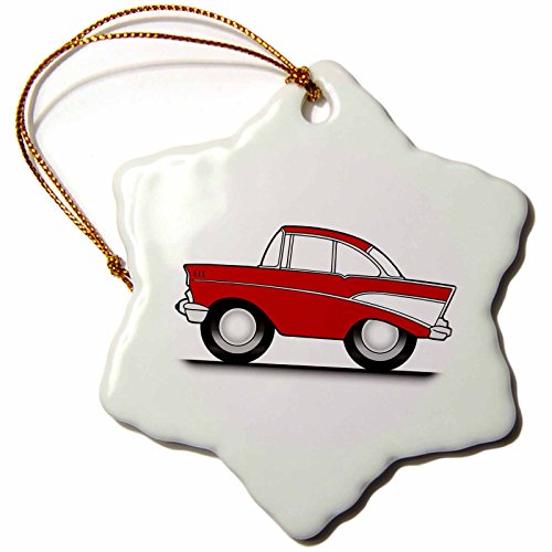 3dRose orn_81023_1 Crazy Hot Rod Red 57 tri-chev Cartoon Style on The pavement Snowflake Porcelain Ornament, 3-Inch