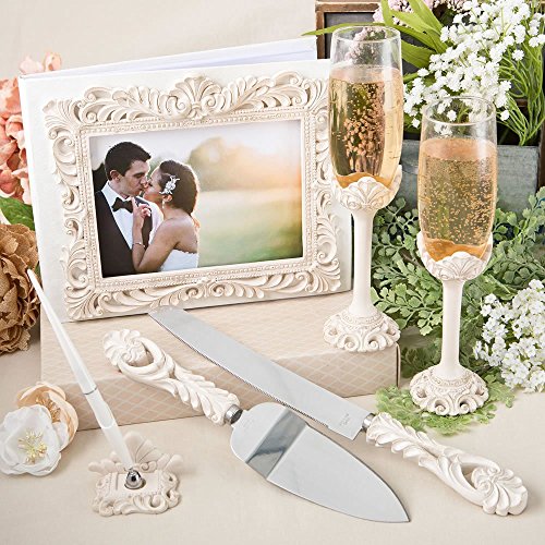 - This fabulous gift set offers four items - A guest book with a photo frame on the front, a set of two toasting champagne flutes, a cake server set and a pen set with a base