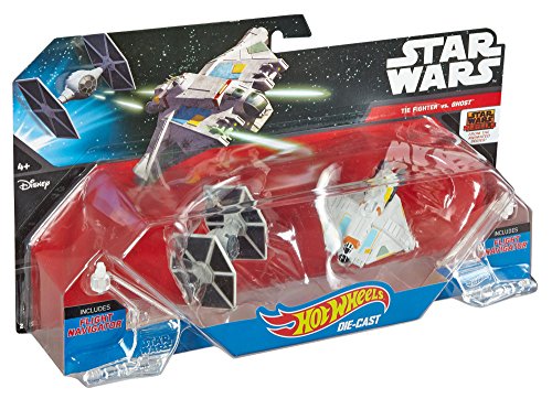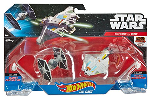 -. Binding : Toy -. Brand : Hot Wheels -. Color : Charcoal,Cream -. EAN : 0651046833321 -. Feature : Kids will love these 2-packs of iconic Star Wars vehicles / Flight Navigator lets kids "fly" their starships / Flight Navigator doubles as a display stand so kids can show off their collection / In a collectible scale that's small enough to fit in a pocket / Makes a great gift for fans of all ages -. IsAdultProduct : 0 -. ItemPartNumber : DLP58 -. Label : Hot Wheels -. Manufacturer : Hot Wheels -. Model : DLP58 -. MPN : DLP58 -. PackageQuantity : 1 -. PartNumber : DLP58 -. ProductGroup : Toy -. ProductTypeName : TOYS_AND_GAMES -. Publisher : Hot Wheels -. Size : Standard -. Studio : Hot Wheels -. Title : Hot Wheels Star Wars Starships Rebels Ghost vs. TIE Fighter 2-Pack -. UPC : 651046833321 -. Warranty : 1 year warranty against manufacturer defects
