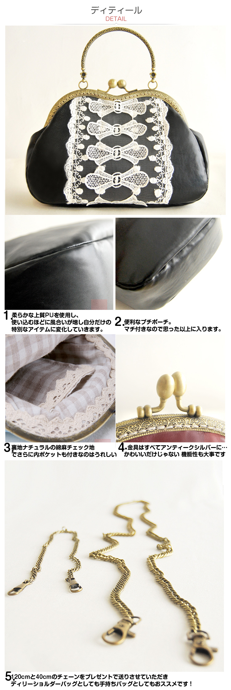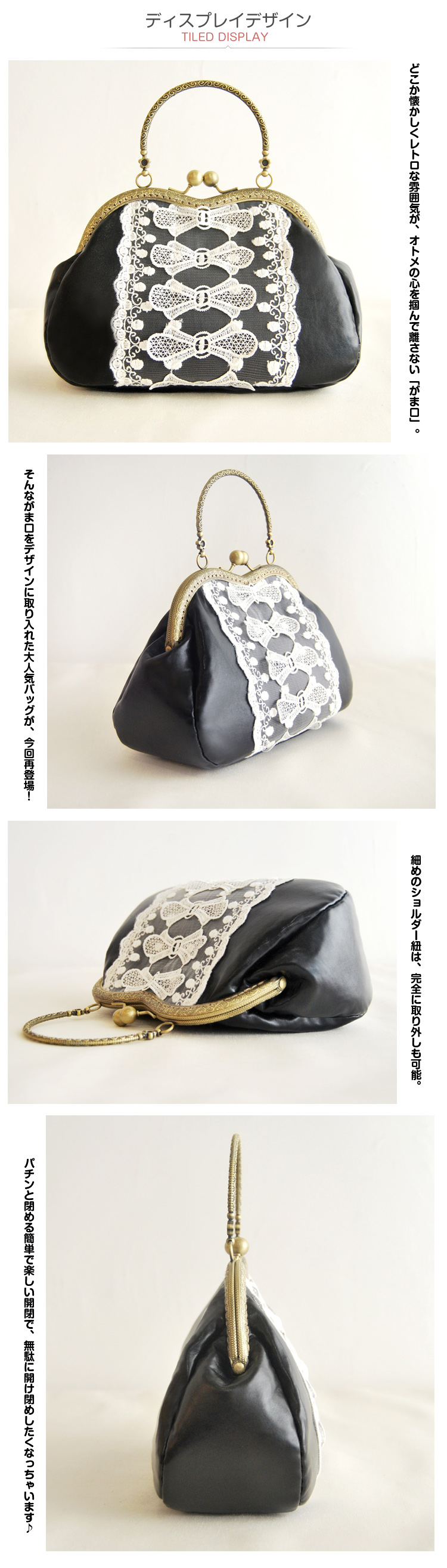 | どこか懐かしくレトロな雰囲気が、オトメの心を掴んで離さない「がま口」。そんながま口をデザインに取り入れた大人気バッグが、今回再登場!より「お財布」感がUPしています?丸みのあるコロンとしたフォルムの可愛らしさと、独特の色ムラやしわ加工が施された上品なフェイクレザーとアンティークゴールドパーツのレトロな雰囲気が人気の秘密です。パチンと閉める簡単で楽しい開閉で、無駄に開け閉めしたくなっちゃいます?小ぶりですが、必要最低限の荷物が充分収納可能です。細めのショルダー紐は、完全に取り外しも可能。肩掛け、ななめ掛けはもちろん、クラッチバッグ風にも持っていただけます。 | |