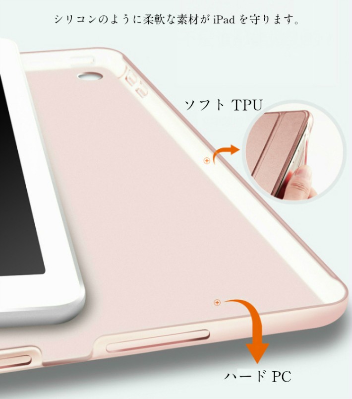 【アップグレード】1.さらに強く!2つの素材で保護性能向上:半透明バックケース部分は、傷防止・衝撃吸収加工が施されたハードPC素材と、衝撃に強く割れにくいソフトTPU素材の2つの素材で構成されており、それぞれ、大切なiPadの背面、コーナー部分を傷や衝撃から保護します。