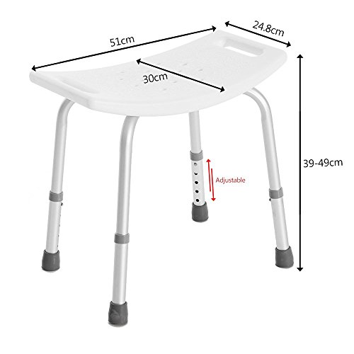 Specifications: Color: White Weight Capacity: 220.46 Lbs 12 drainage holes on the seat. 5 level of seat height adjustments Item Size(installed): 51 * 30 * 39-49cm / 20.08 * 11.81 * 15.35-19.29in Item Weight: 1641g / 57.88oz