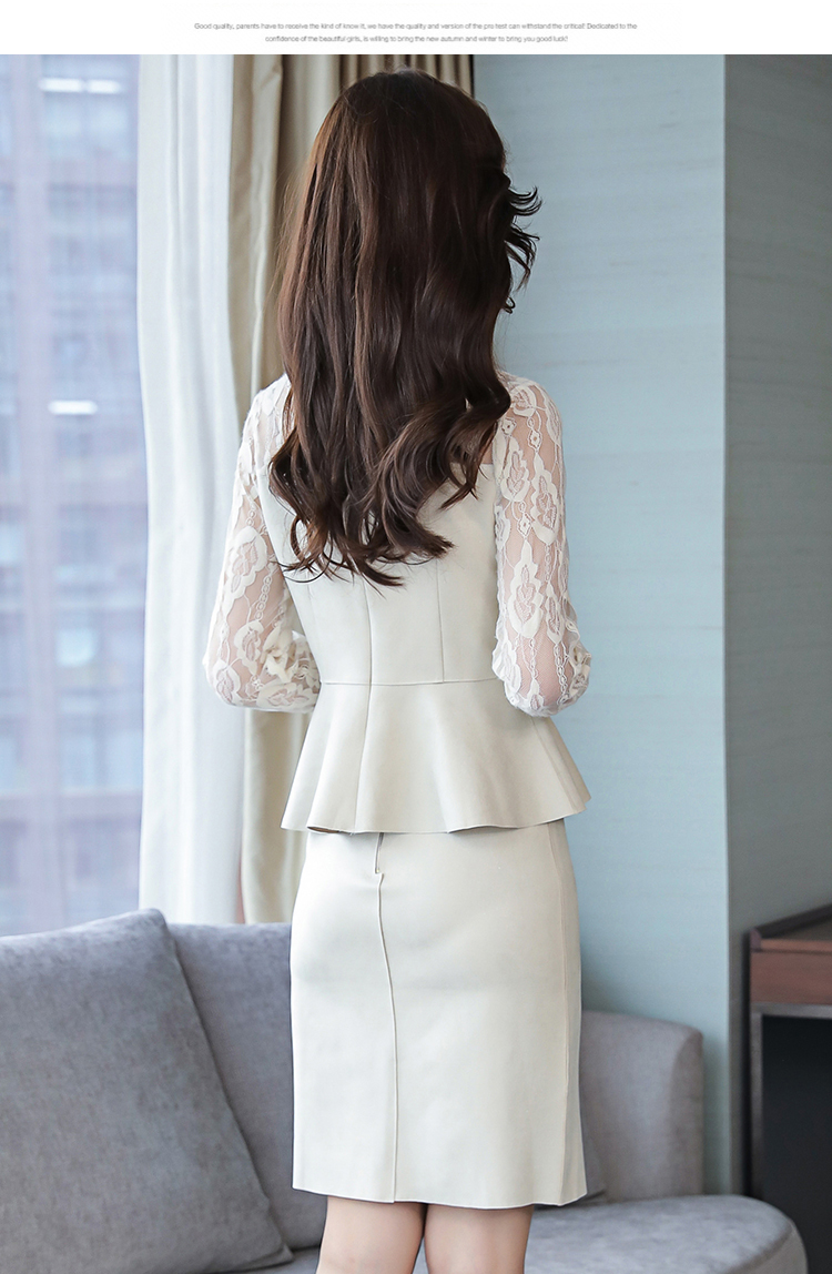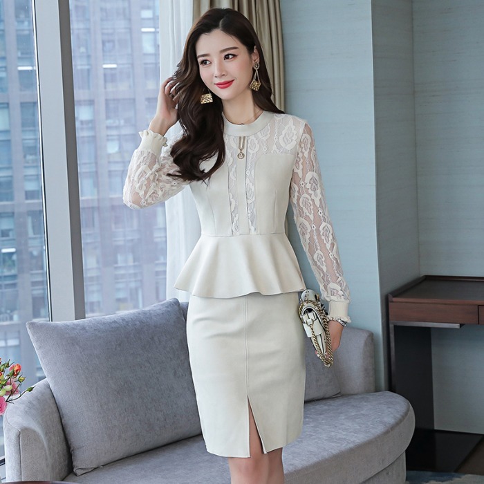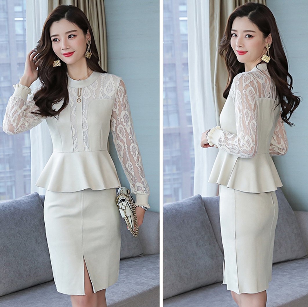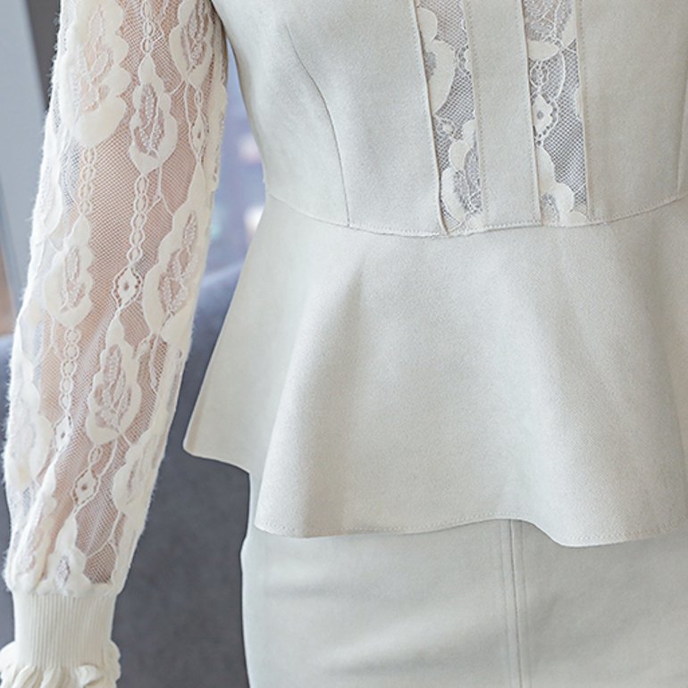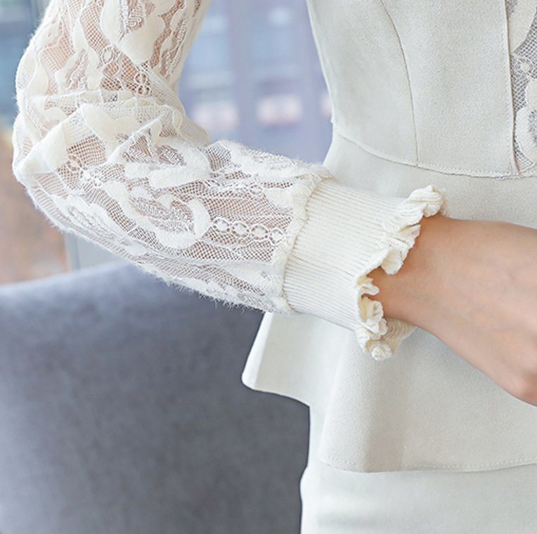 きれいめ レース シースルー袖 前スリット タイトスカート 2ピースセット セットアップ 通勤 エレガント フリル 膝上 クルーネック