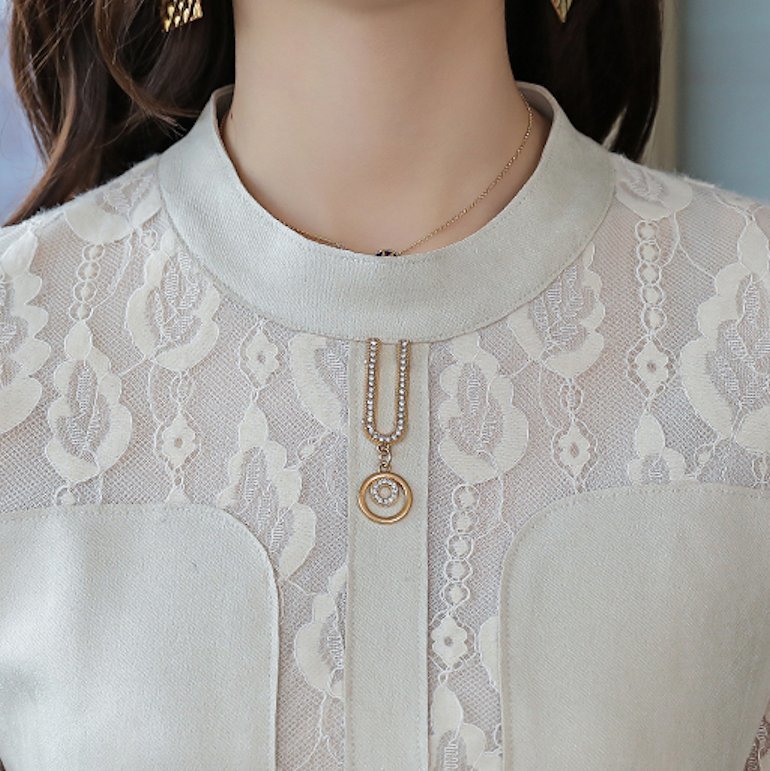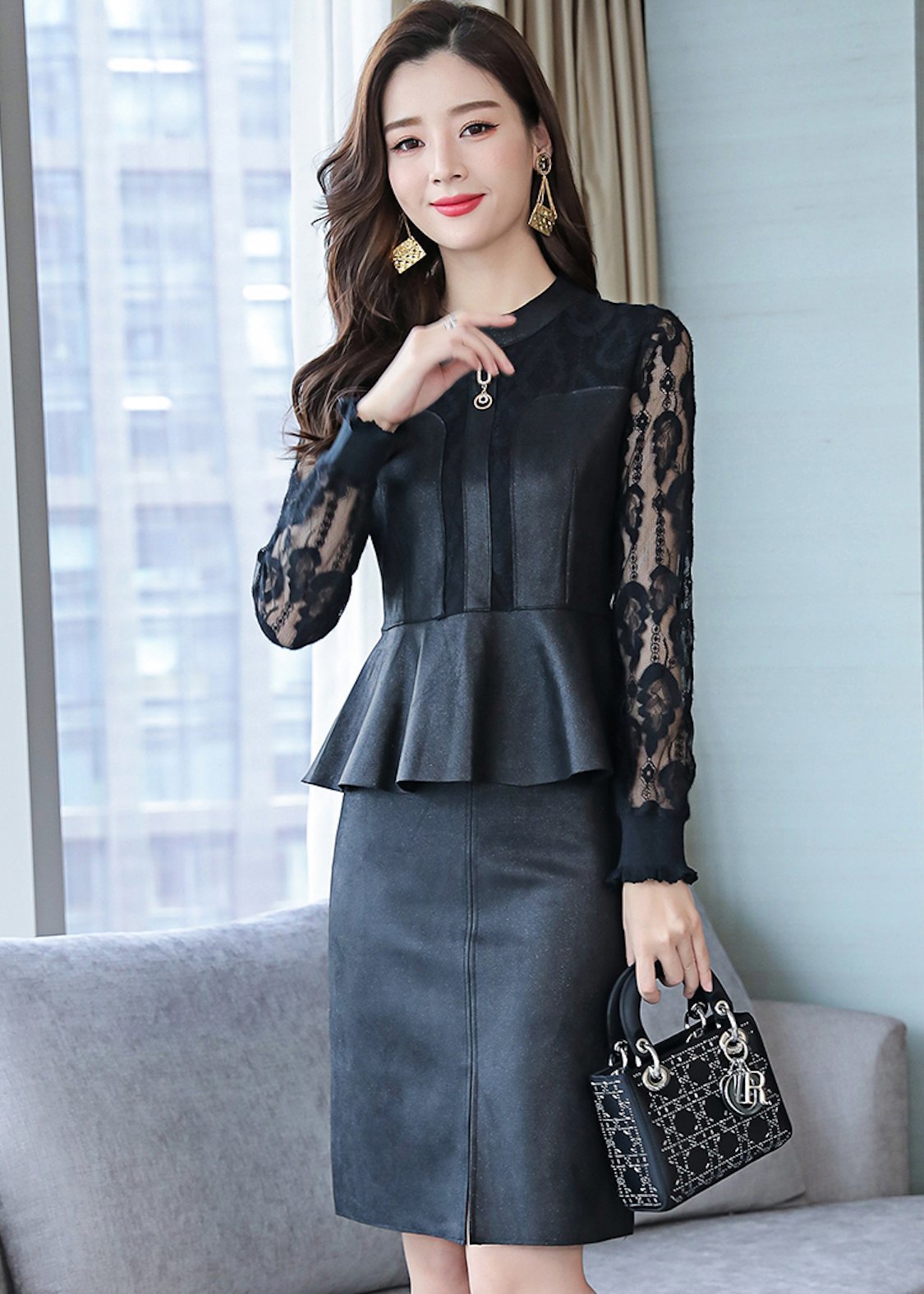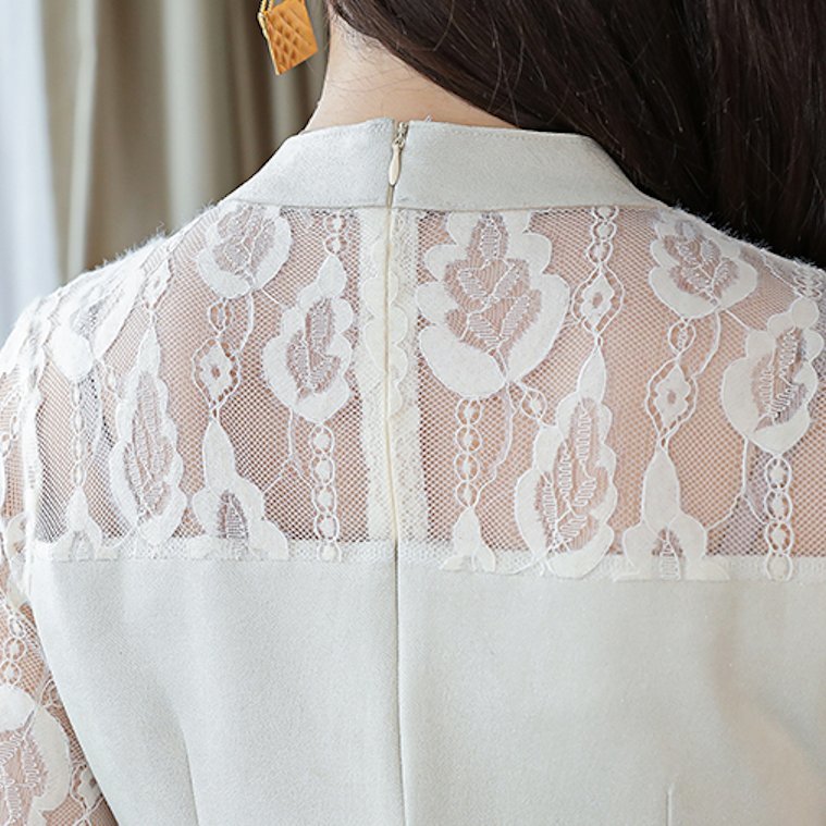上品なレース柄トップスとミニ丈タイトスカートのセットアップ。