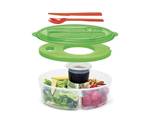 - Includes fork, knife, bowl with 3 large compartments, dressing bowl, cover, and lid
