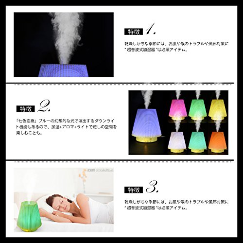 -. Feature : ◆【大特価】本製品は今セールしているので、原価は3699円ですよ。手に入れたい方は見つけたら即買いをお勧めします。 / 【超音波振動の安心構造】超音波加湿器は、水に超音波の振動を与えて水の分子を細かくし、内蔵のファンによって部屋中にミストを噴霧する仕組み。ヒーターなどにより水を沸騰させることはないので、触っても熱くありません。小さいお子様やペットのいるご家庭でも、安心して使える加湿器です。 / 【ミストがすぐ出る】超音波加湿器はヒーターで水を温める必要がないので、電源を入れるとすぐにモクモクのミストを吹き出します。室内が乾燥していて今すぐ加湿器したい!!という時は、すぐに出るミストは嬉しいですよね。 / 【動作音がとっても静か】超音波加湿器の動作音は、ミストを吹き上げるファンの小さな音だけ。特に乾燥が気になる就寝時のご使用にもピッタリです。【七色LED付き】七色のカラーLEDライトを内蔵しており、アロマの香りと視覚による癒やしの空間を演出します。 / 【様々な効能】加湿の効能・加湿器によって、乾燥(湿度の低下)を防ぐことは、色々な効果、効能につながると言われています。アロマの効能 アロマエッセンスといえば、多くの方がやさしい癒しの香りをイメージする方が多いと思います。