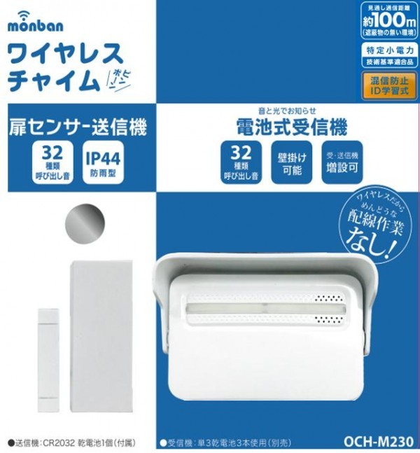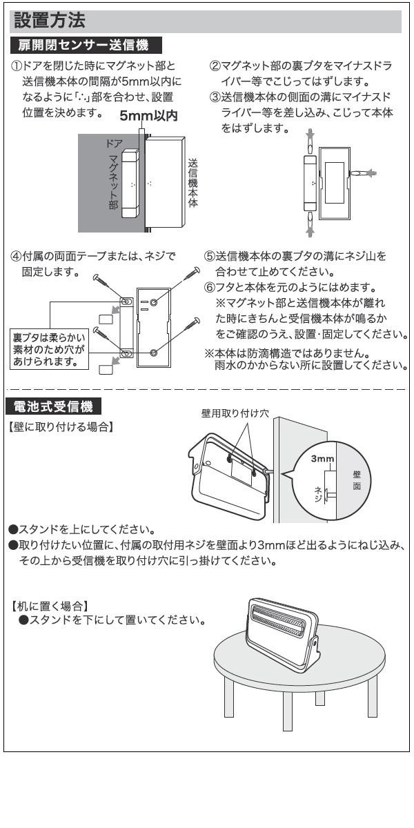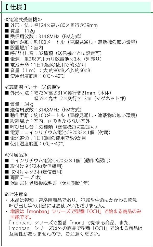 | 仕様 | 【受信機】 ・受信周波数:314.8MHz(FM方式) ・設置場所:室内 ・呼び出し音:32種類 ・電源:単3形アルカリ乾電池×3本(別売り) 【送信機(扉開閉センサー)】 ・送信周波数:314.8MHz(FM方式) ・設置場所:室内、雨の当たらない室外 ・電源:コインリチウム電池CR2032×1個(付属) |