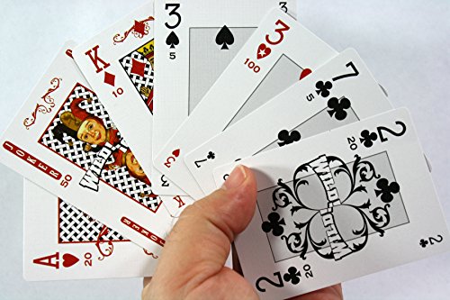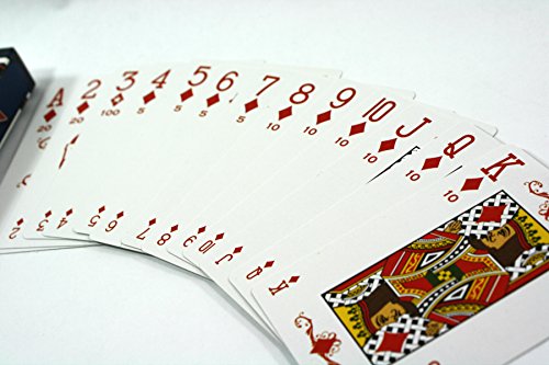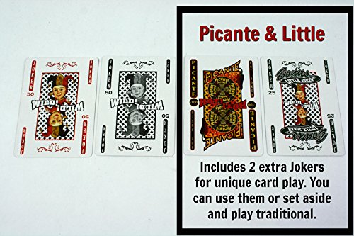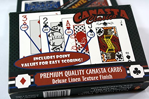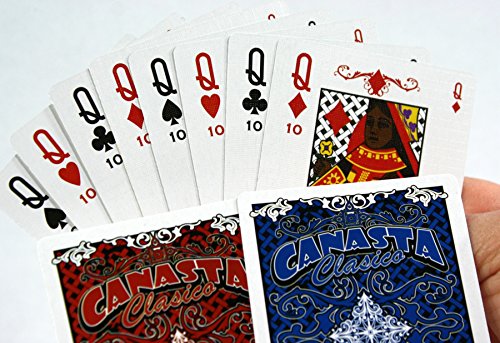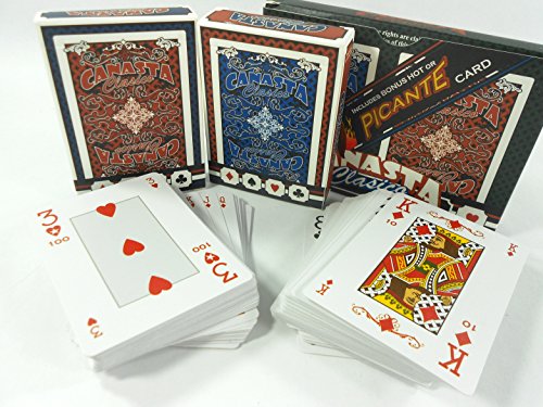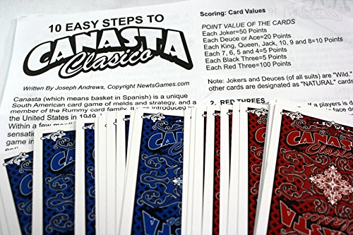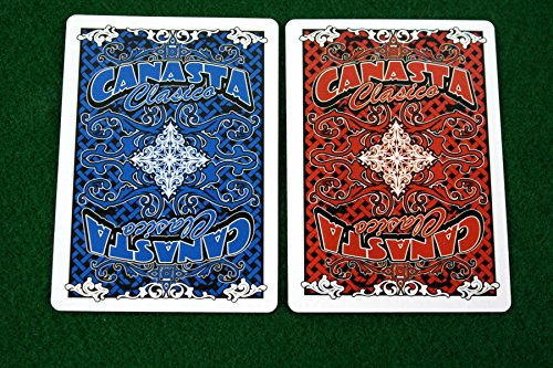 Double deck set of deluxe "Canasta Clasico" playing cards! Each card face includes point values for easy scoring. They work great for any variation of canasta you may play! Remember, this item INCLUDES TWO DECKS OF CARDS (104 4 Jokers 4 Bonus Cards). What makes these cards special? - Highlights on wild cards. - The card stock we use for these decks has a linen finish and is a little thicker to allow for longer card play and a better "snap" when you shuffle. - Features 2 decks of cards which then makes 104 normal cards and 4 jokers. Each set includes 1 deck of blue back and 1 deck of red back. - Includes "10 Simple Rules to Canasta" to help refresh you canasta skills. We've added a little twist to normal canasta play with a 3rd Joker we call "Picante"...to add a little spice or heat to your next card night. We've also added a 4th "Little Joker" (worth 25 points instead of 50). Both cards are optional to use or set aside. There are a variety of canasta variations that can be played with this deck but it may require more sets depending on which you play. Hand and Foot, Samba and Pennies from Heaven to name a few. Another fine product created for discerning card playing fans and printed in small runs by Newt's Games and Cards. 0 |