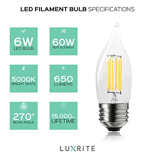 6-Pack LED Chandelier Bulb, Luxrite, 6W (60W Equivalent), 5000K Bright White, 650 Lumens, LED Filament Bulb, Flame Tip, E26 Base, UL Listed