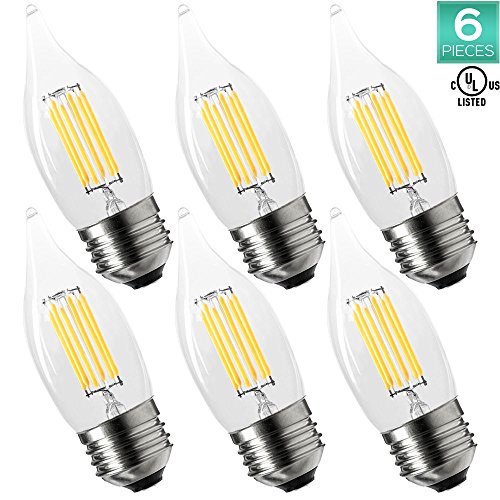 - CONSISTENT QUALITY - Clear glass with low temperature LED filaments, each light bulb is constructed to provide zero flicker and instant on lighting that lasts 10x longer than 60W incandescent candle light bulbs. NO mercury and NO UV in this eco-friendly design and is also UL Listed for your safety, so you know are getting the best in LED lighting.