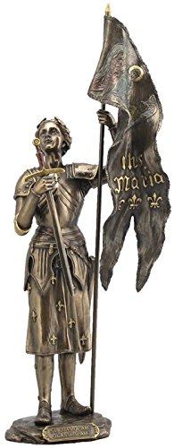 Folk Hero Saint St Joan of Arc with IHS Maria Flag and Sword Cold Cast Bronze Statue Figurine