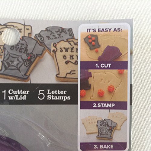 - Sweet Creations Tombstone cookie cutter set includes lid and letter stamps.