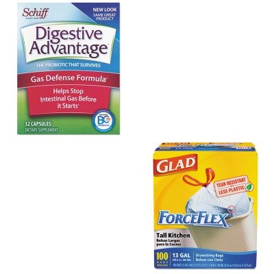 Studio : Reckitt Benckiser Publisher : Reckitt Benckiser Binding : Office Product Product Description strongDVA00136/strongBR/Reckitt Benckiser Probiotic Gas Defense CapsuleBR/Helps manage intestinal gas, bloating, pressure, and flatulence. Our formula is different than many gas products, which primarily address stomach gas. Contains: BC30 Digestive Enzymes Description: 32 Capsules Quantity: 32 per box.BR/BR/strongCOX70427/strongBR/Glad ForceFlex Tall-Kitchen Drawstring BagsBR/One quick pull and its closed Only Glad has the strength of ForceFlex, the unique diamond-textured plastic that stretches, preventing rips and tears. Three-layer drawstring makes even the fullest bag no problem to close, lift and carry. Application: Can Liner Capacity Range Volume: 13 gal Materials: Plastic Colors: White. 0