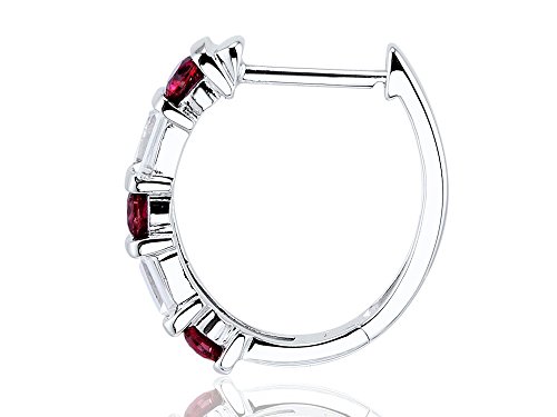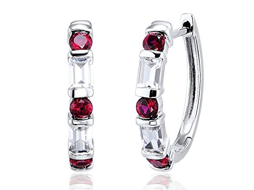 Very fashionable hoop earrings featuring alternating round Lab Created Rubies and baguette shaped Lab Created White Sapphires. Set in Rhodium Plated 10k white gold. The rubies are 2.5mm each and the sapphires are 3.5 x 2.5mm each. The earrings are approximately 1/2 inch x 2/3 inches. They are 2.5mm thick. Earrings have a hinged notched post back. We recommend cleaning with soapy water and a soft clothFeature
