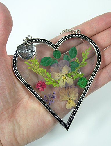 I Love You - Heart Sun Catcher - Pressed Flowers Suncatcher with I Love You Hanging Charm