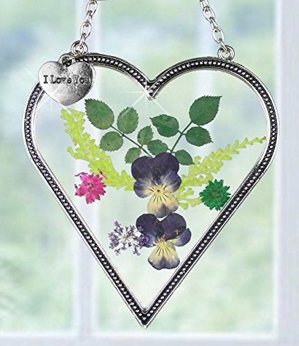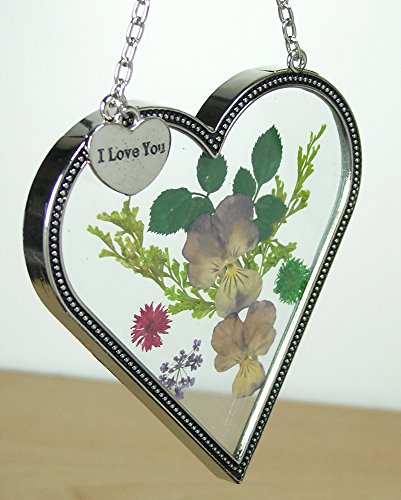 HEART SUNCATCHER. Real flowers pressed between glass in this colorful heart suncatcher. Hanging heart charm with "I Love You" engraved on it.