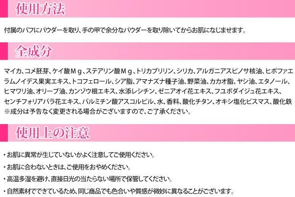 | ミネラルと米胚芽パウダーをベースとしたフェイスパウダーです。毛穴を塞ぐことなく、軽い質感のパウダーがお肌に密着し、ナチュラルでマットに仕上がります。ファンデーションのあとにフィニッシュパウダーとして使用したり、ファンデーションを塗らずに使用することもできます。ふんわりやわらかい印象なので、ノーファンデーション派の方にもオススメです。 |