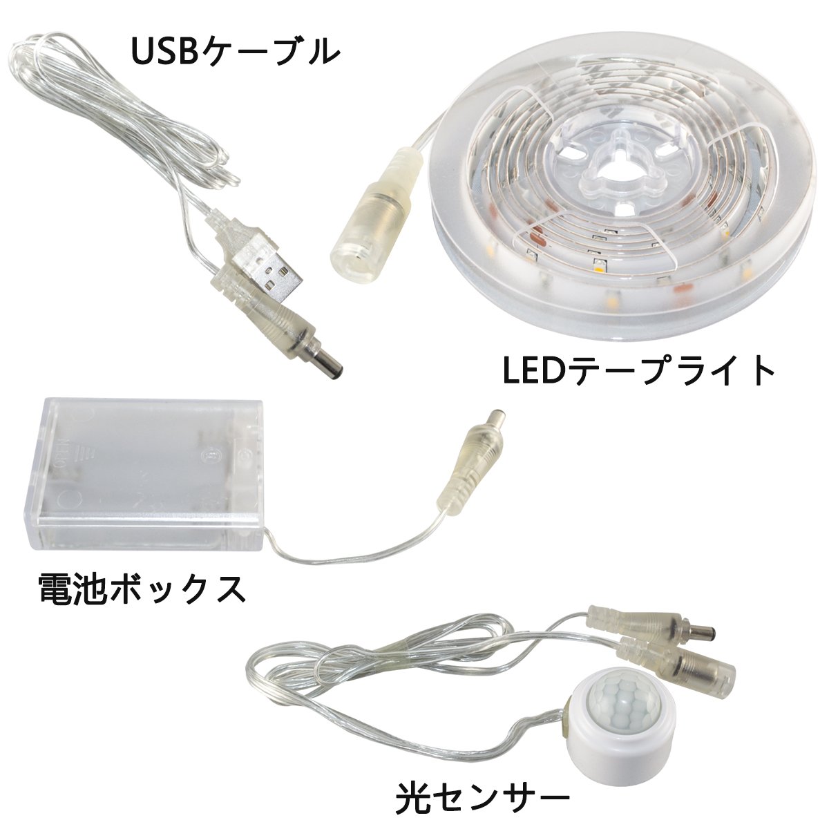 100 cm LED tape light * 1, USB cable * 1, battery box * 1, light sensor * 1