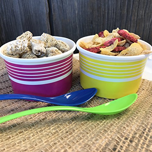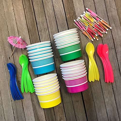 This is the perfect little sundae kit for your next birthday gathering or picnic. Great for a sundae bar! Each kit includes 6 paper cups in 4 colors, 24 plastic spoons and 24 umbrella picks for decorating.Feature