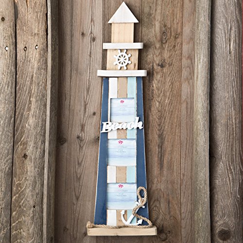 -. Feature : Lighthouse decoration picture Frame / Size is 20Tall x 5 3/4x 1 1/2 / Nautical theme colors in blue, Cream and tan / Raised 'beach' word, anchor and ship's wheel / A unique decor item to showcase those great vacation moments