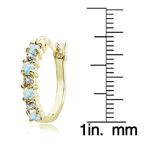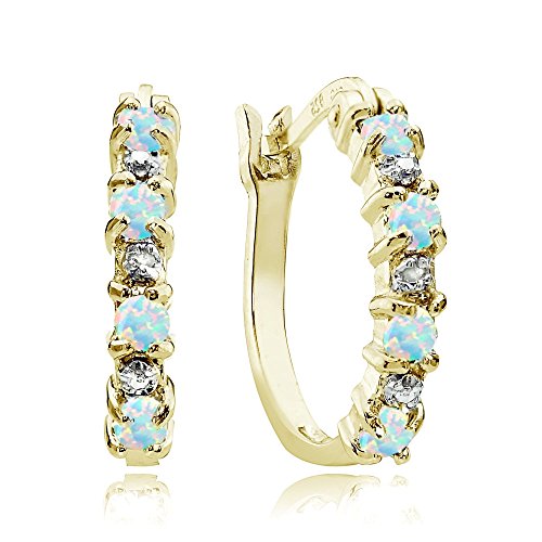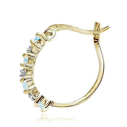 These distinctive earrings feature brilliant created opal gemstones and diamond accents set into high polished gold tone over sterling silver hoops. They are secured by post with snap down clasps.Feature