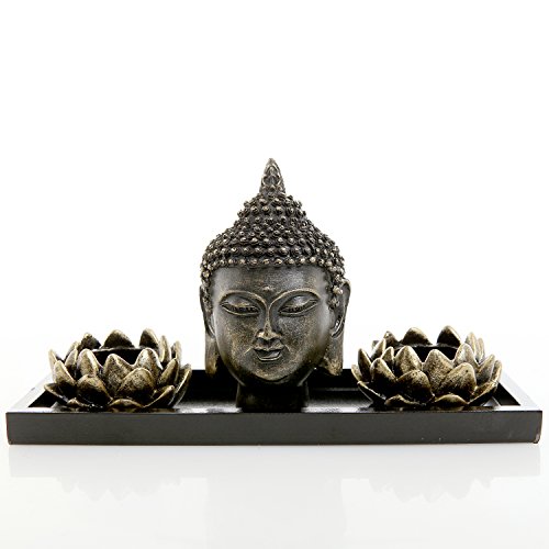 MyGift Buddha Head Sculpture Zen Garden Set w/ Lotus Tealight Candle Holders & Wooden Display Tray, Black