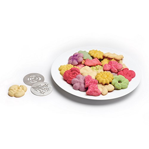 • Includes 12 stainless steel cookie disks in different patterns, including: Daisy, Flower, Sunflower, Fleur-de-lis, Butterfly, Bear, Shell, Leaf, Heart, Snowflake, Tree, Wreath