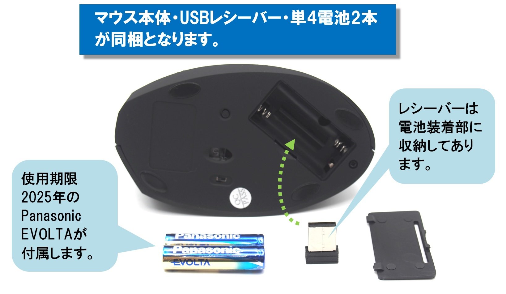 Included contents: Mouse body, USB receiver, 2 AAA batteries for the first time (Panasonic EVOLTA)